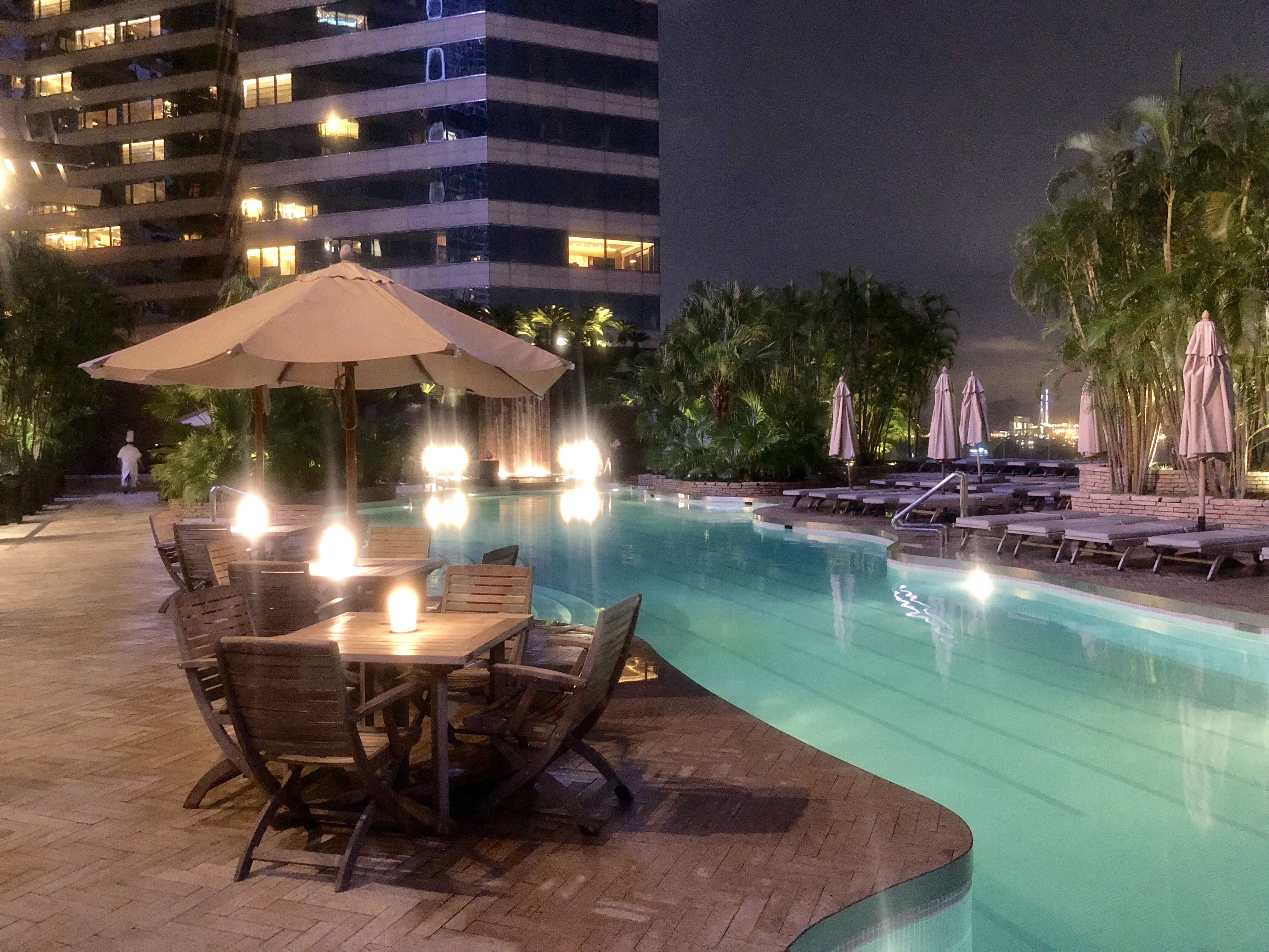 プールサイドのテーブルに座れば、九龍の夜景も一望できる!