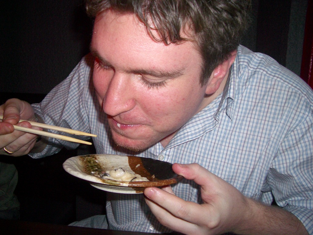 『やまかけ〜〜』入口から叫んでいる。山かけマグロの『ヤマカケ ダケクダサイ』ジョン&クリスは『もずく』も好きだ。これも『ま○げ、クダサイ!!』と絶叫している。特製ソーセージを『ち○ぽクダサイ』と注文して、ママさんが、テーブルでカットしてくれるのだが、『イタイヨ〜〜イタイヨ〜』と股間を押さえて叫んでいる。もうだめだ。しまいに、ウーロンハイの中に、もずくや刺身やわさびを投げ込んで 『特製 ウーロンハイ』のイッキがはじまった。じゃんけんに負けたやつが飲むのだ。『ださなきゃだめよ じゃんけんぽん!』もうまわりのお客は香港同様どんどん帰っていく。完全な営業妨害だ。