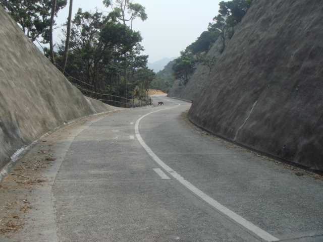 舗装された金山道をさらにすすむと、さきほと通過したウィルソントレイル ルート6と重なる。ここから、九龍水塘までは、広めの車道のなだらかな下りだ。標距柱M120の前後に サルがまた多数出現した。S氏は三八式歩兵銃をサルに向けながら、いつでも戦闘態勢に入れるように警戒していた。今回は、襲われなかった。またセックスをしている間抜なサルもいなかった。