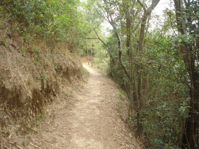 しばらく薄暗いくねくねとした平坦な山道を歩行することになる。時々左手の木々の間からから九龍水塘が見下ろせる。