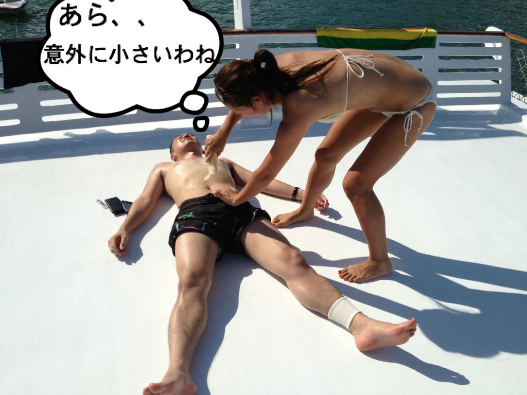 ボートのアッパーデッキでは、まつけんくんが、ローションずっぽし