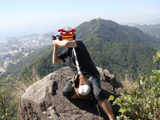 さらに進軍し、ライオンロックの撮影にピンク師匠はさらに危険な岩場によじ登った。