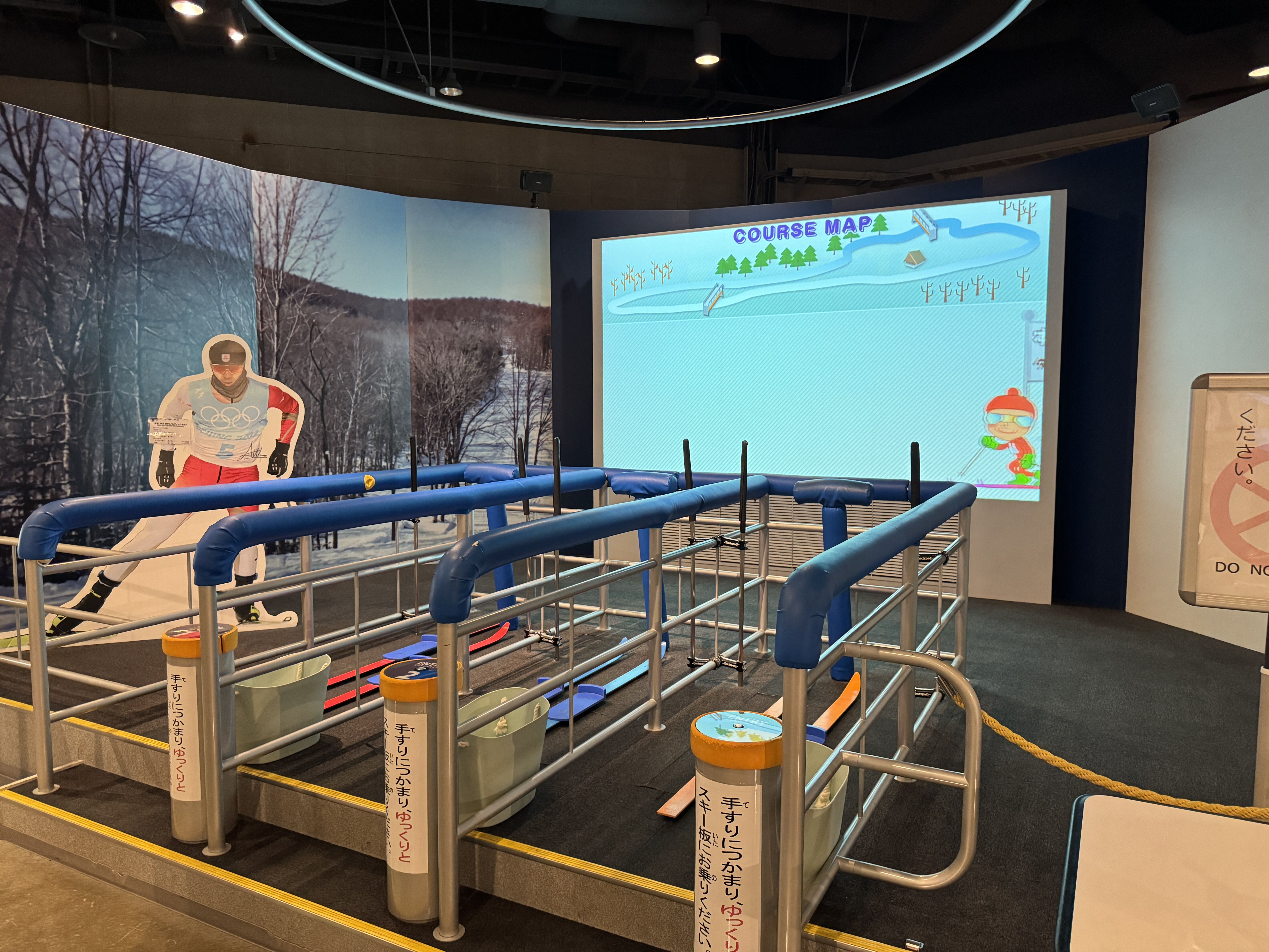 雪上のマラソンといわれるクロスカントリースキー。コース映像を前に、実際にスキーを動かしてレースを体感しよう。参加者同士で競争もできます