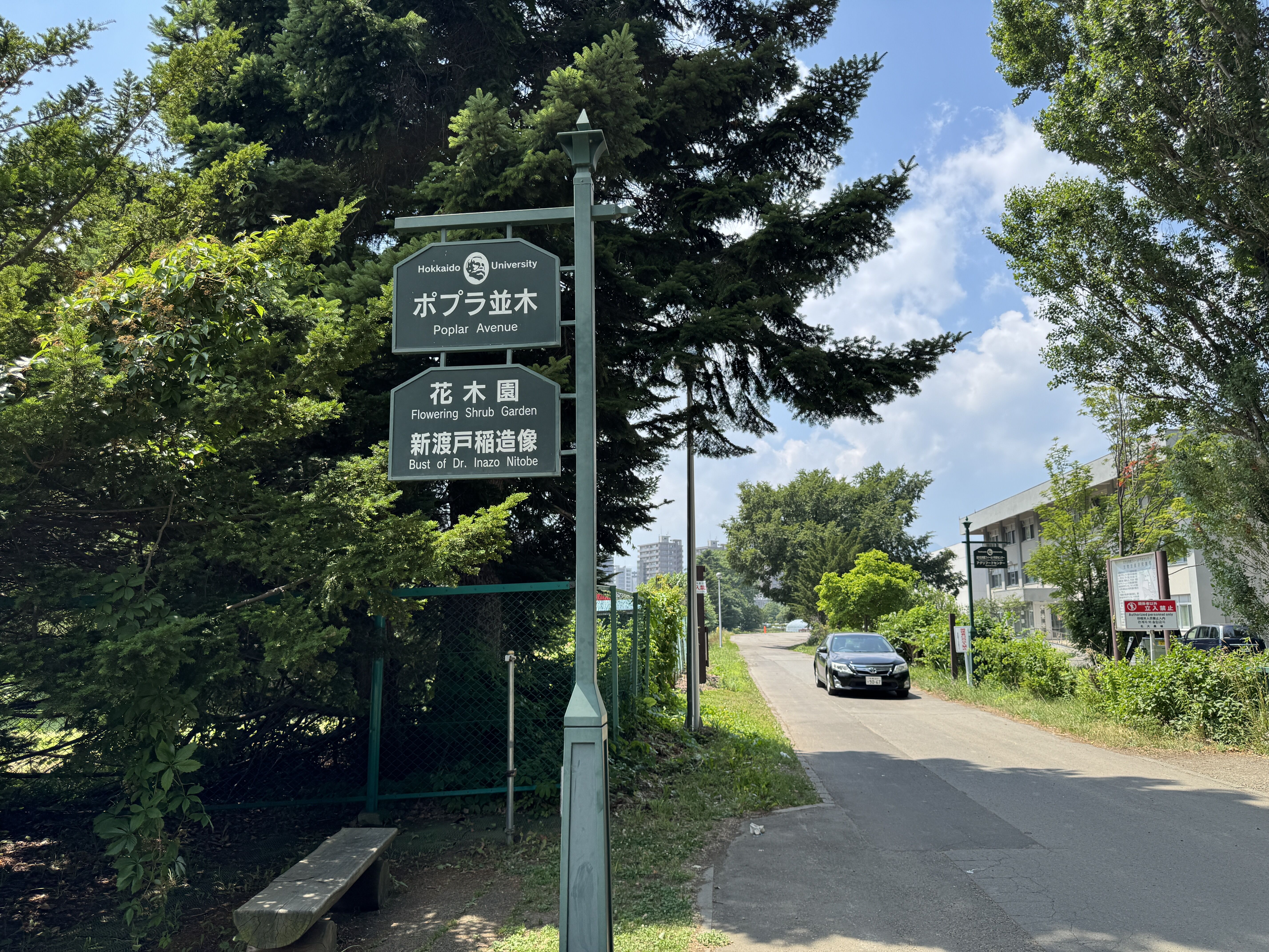 ポプラ並木の横には新渡戸稲造の銅像が