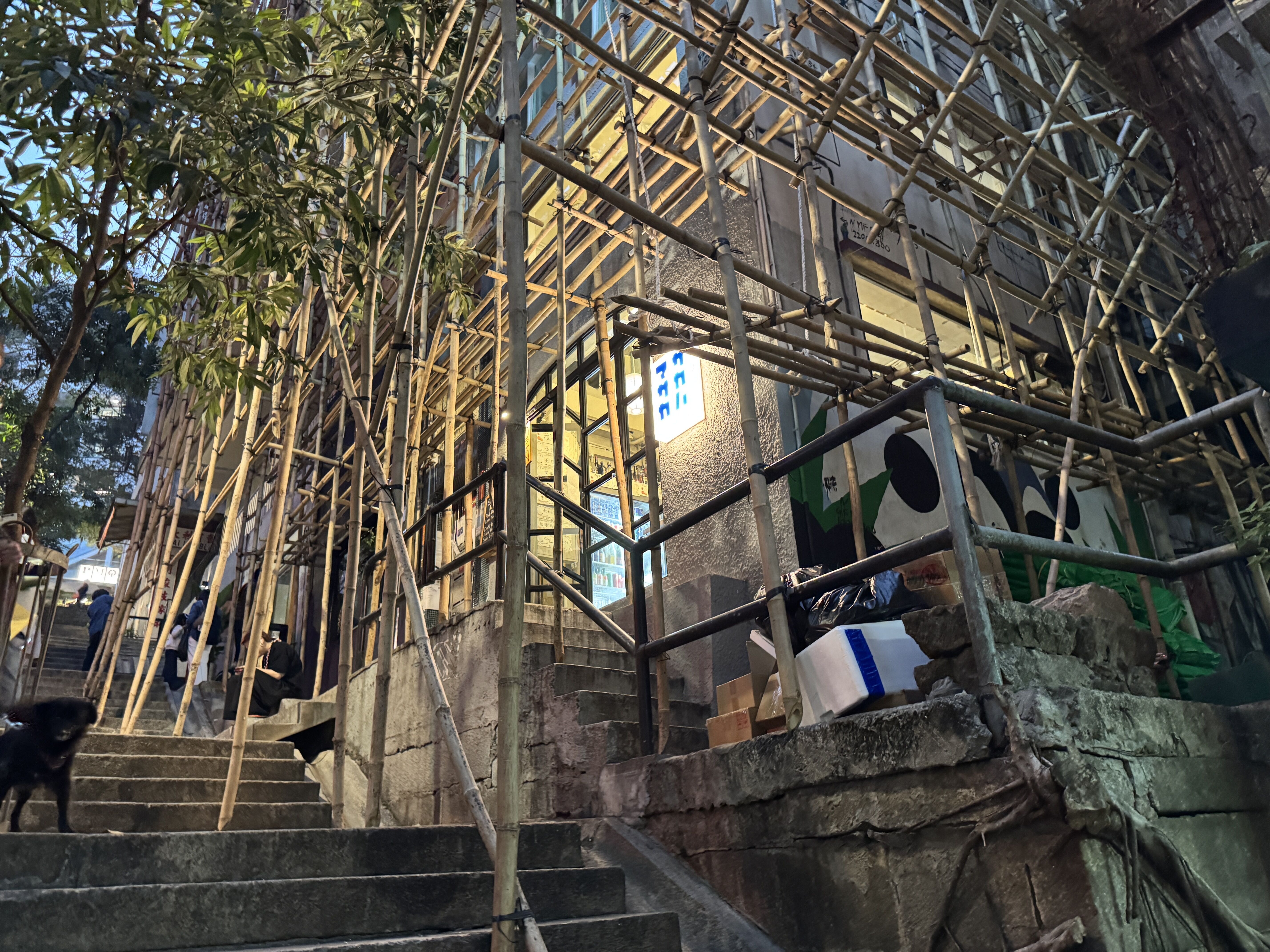 香港大火事ですっかり有名になった竹足場がお店を囲んでいた😱