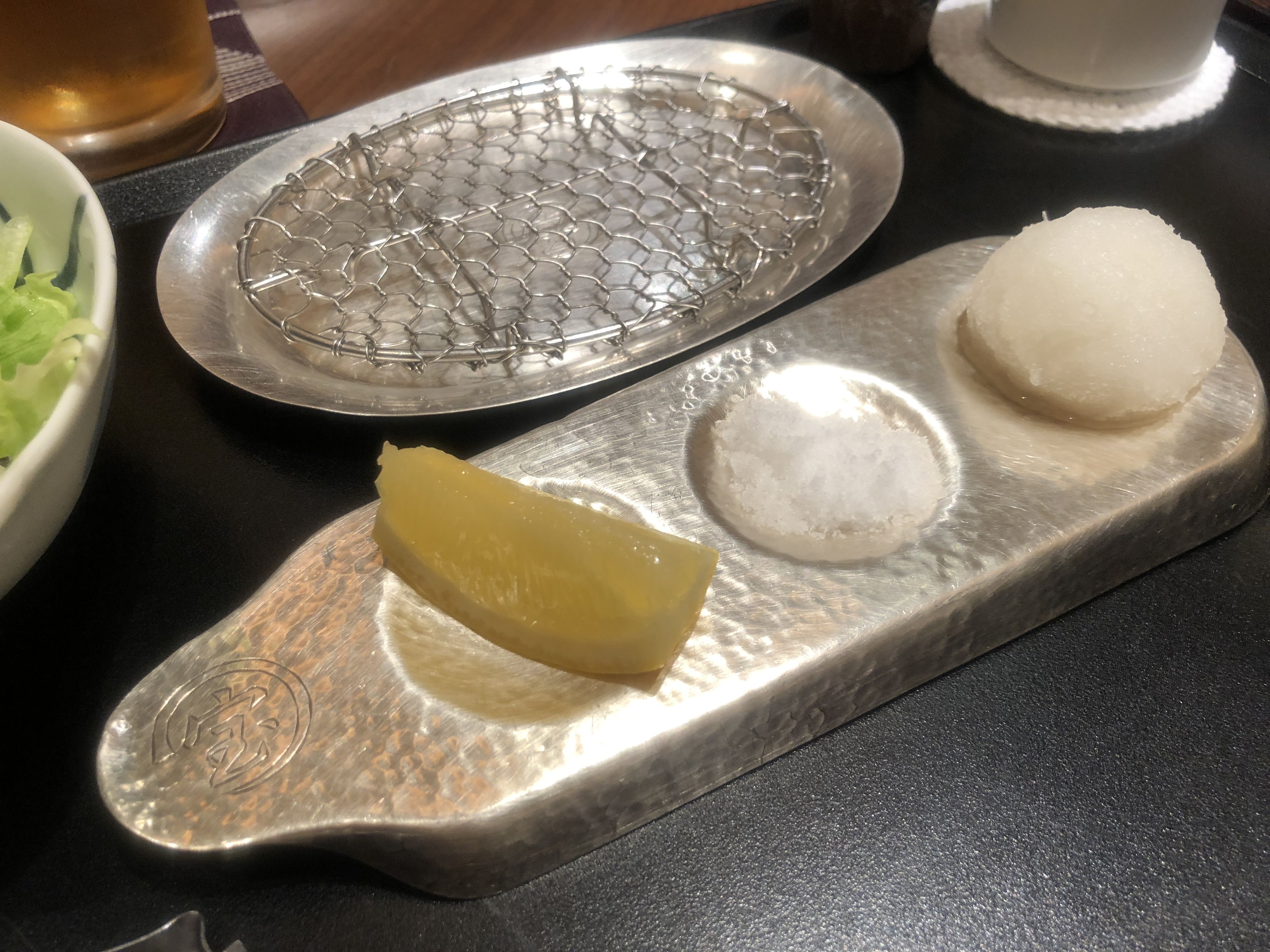 お好みで、塩、レモン、大根おろしなど