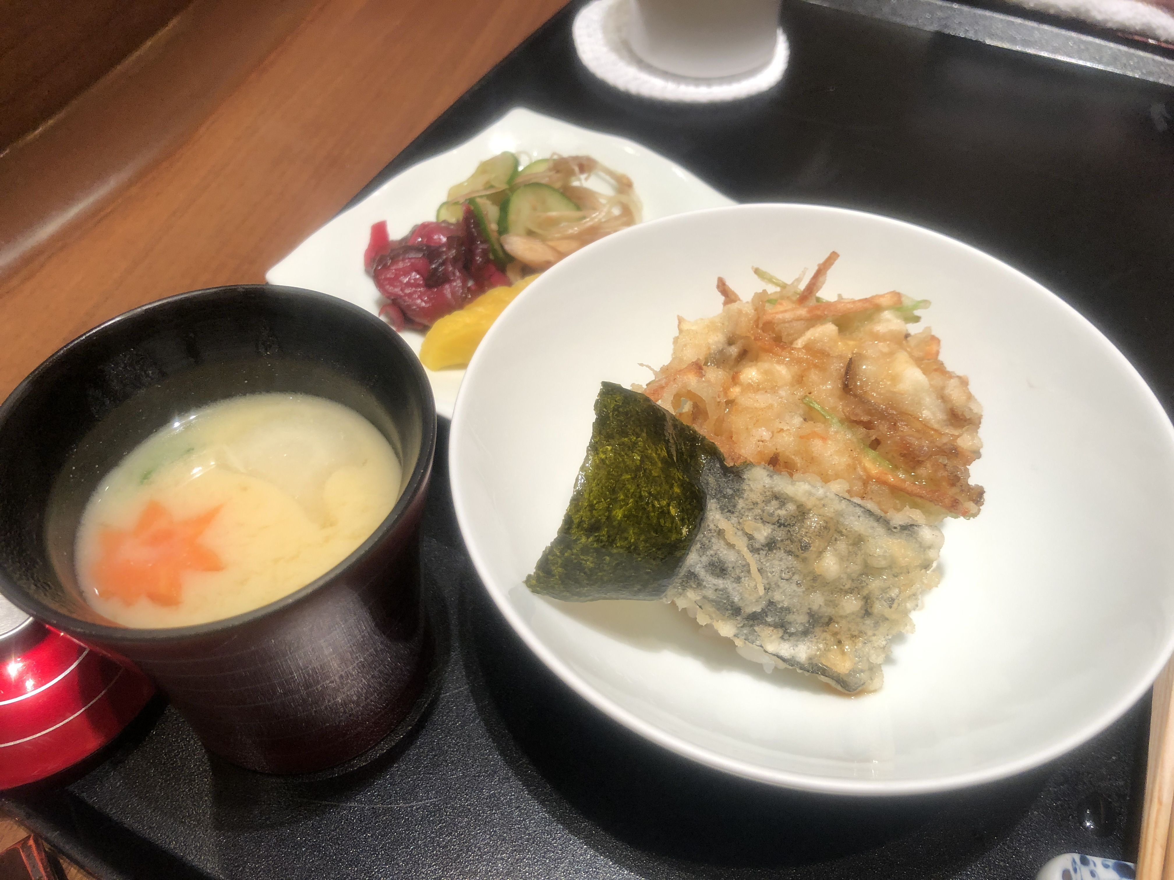 テーブル席に移動して、天丼、、量が少なめなのは個人的には助かるな、、