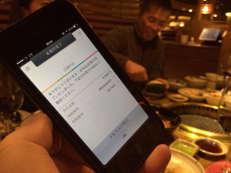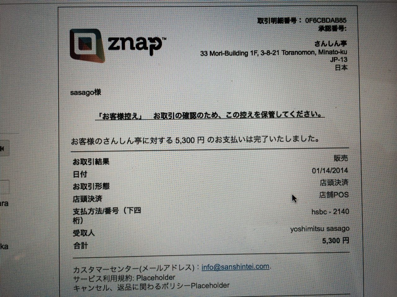 先日ツケで飲んだ支払い(5300円)をQRコードで携帯にメールしてもらい